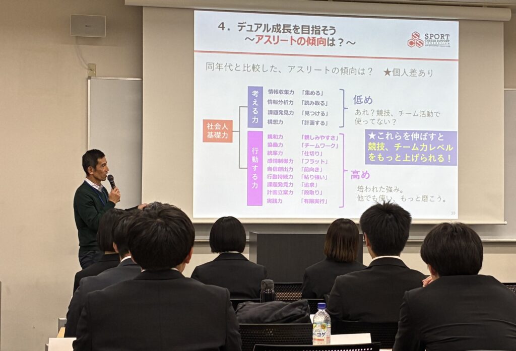 ご自身の競技経験やキャリアはもちろんのこと、人生の先輩として、実感のこもった講義とワークが行われました。